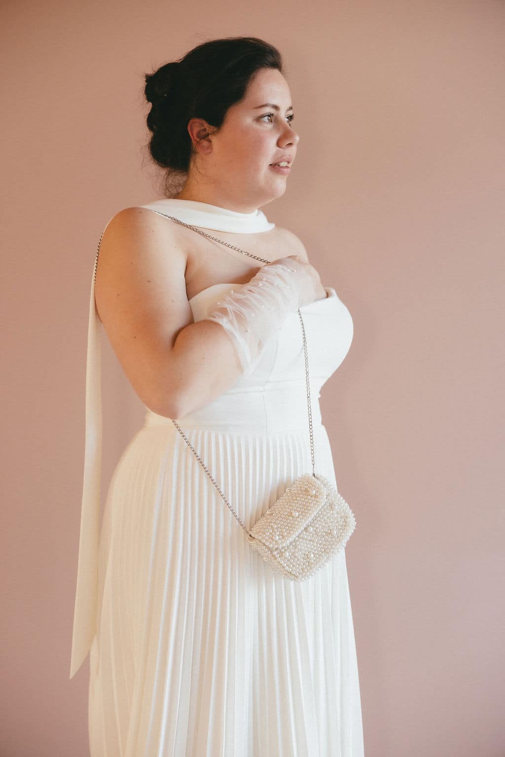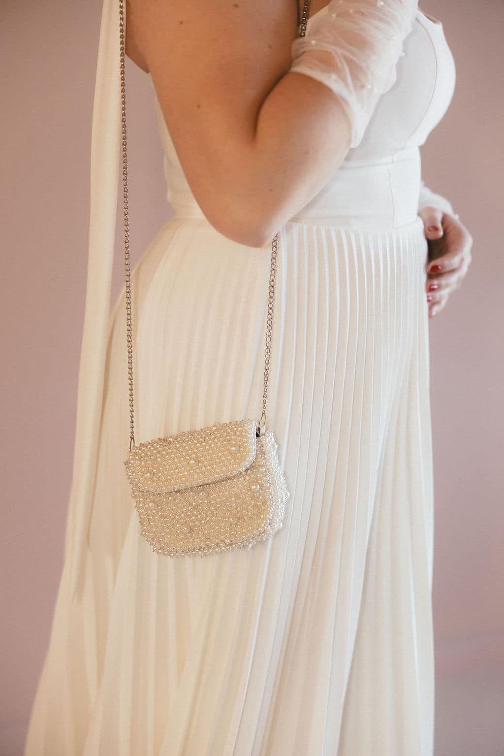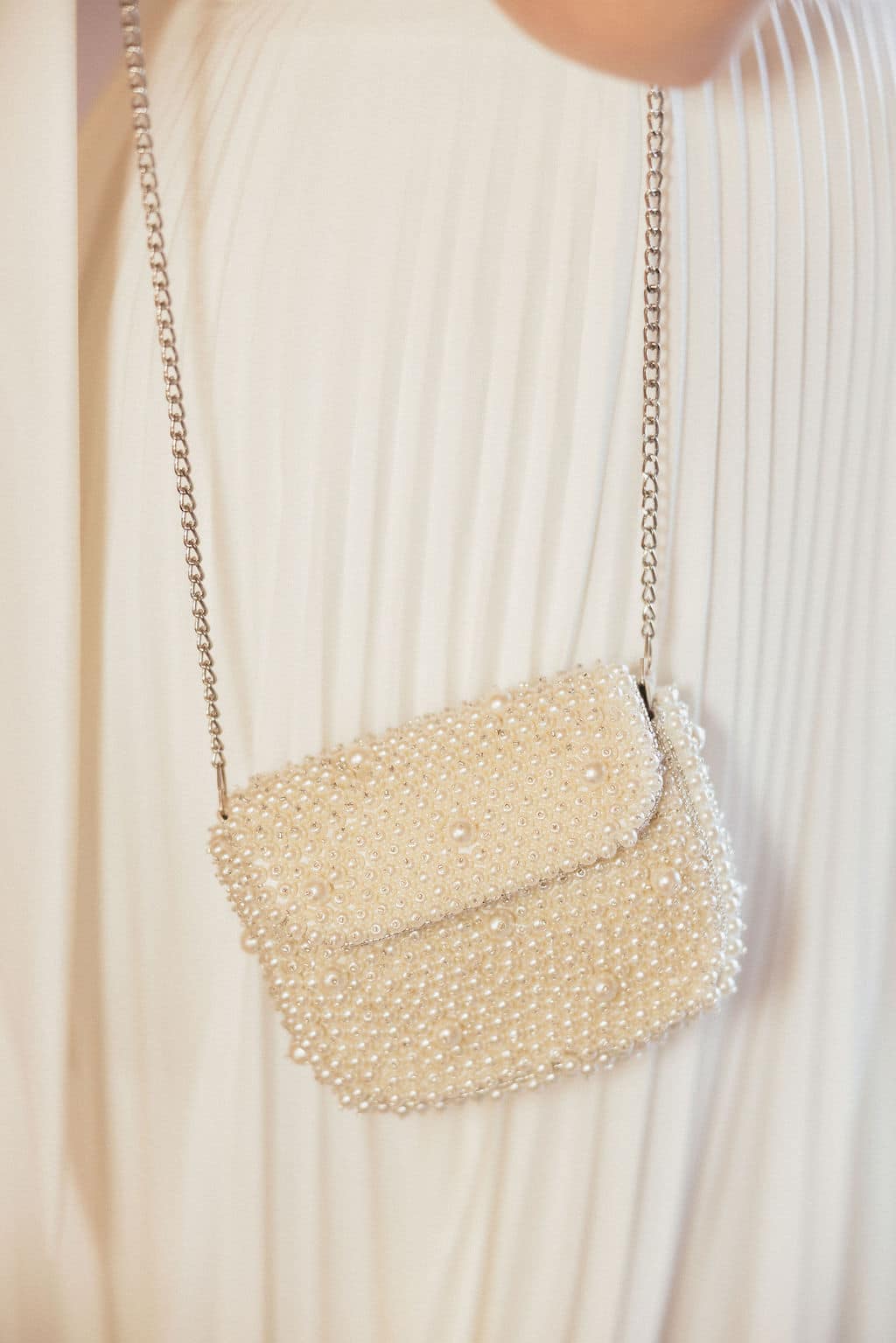 Discover our small wedding clutch bag with a shoulder strap and silver chain—both elegant and practical. Compact yet cleverly designed, it lets you keep your essentials close at hand: your phone, a makeup touch-up kit, or even a pack of tissues. The Lina Beaded Clutch is the perfect accessory to complement your outfits at special events.
