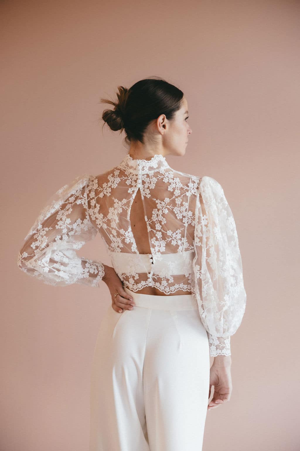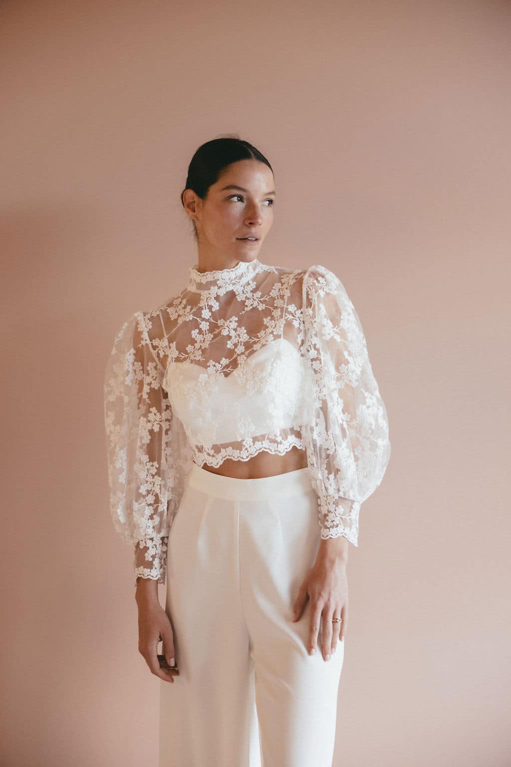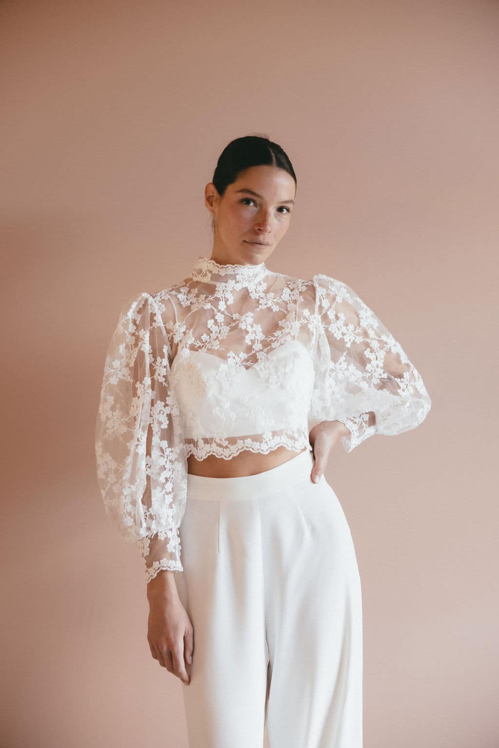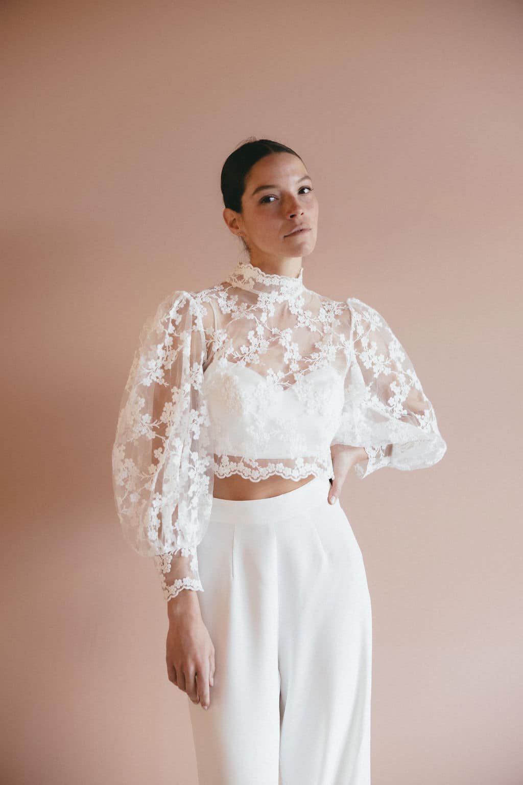 Descubre nuestra blusa de novia Ambre, con sus bonitas mangas abullonadas y su cuello alto, que le confieren un aire a la vez romántico y elegante. Lo que más nos gusta: su delicado encaje con forma de florecitas.