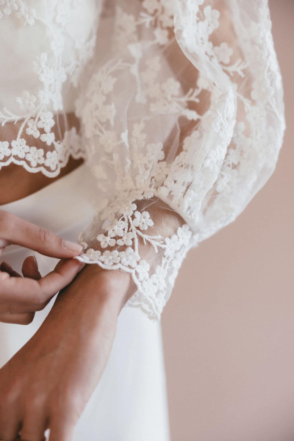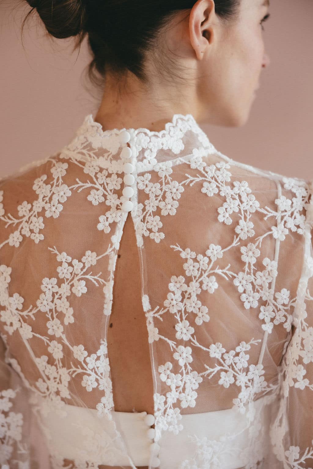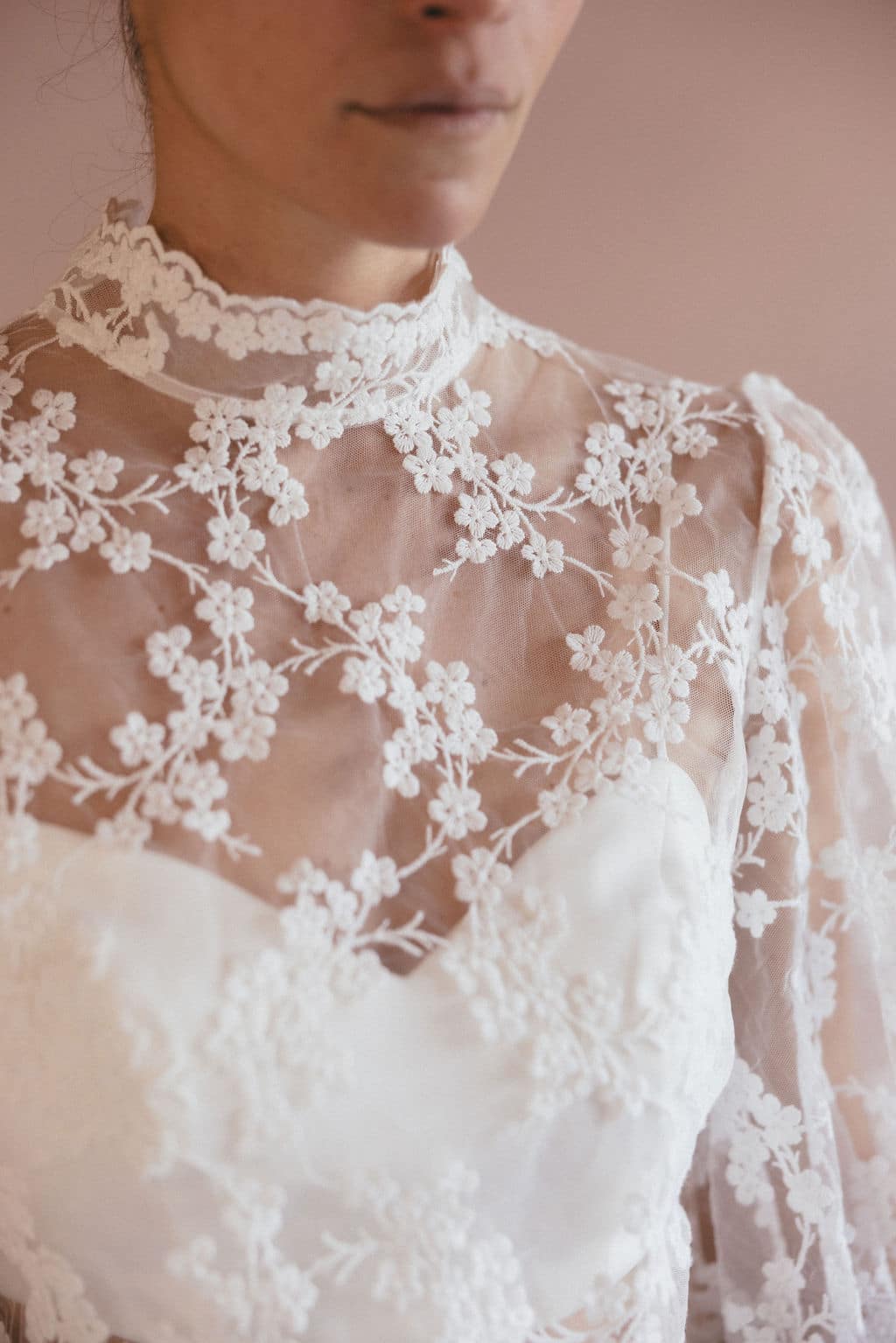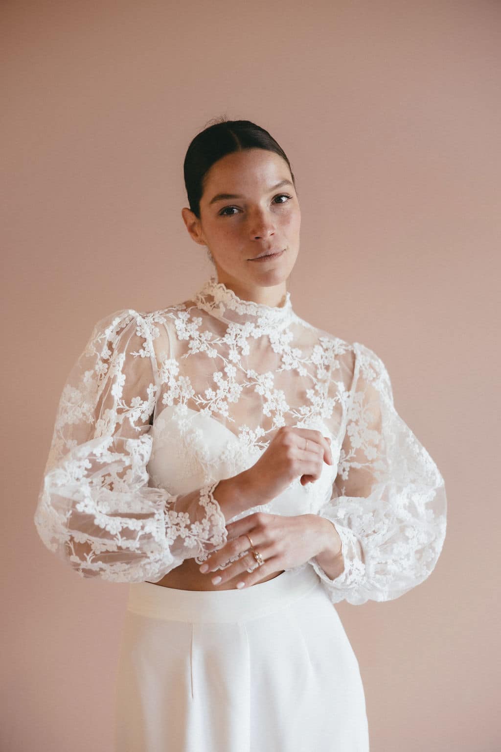 Descubre nuestra blusa de novia Ambre, con sus bonitas mangas abullonadas y su cuello alto, que le confieren un aire a la vez romántico y elegante. Lo que más nos gusta: su delicado encaje con forma de florecitas.