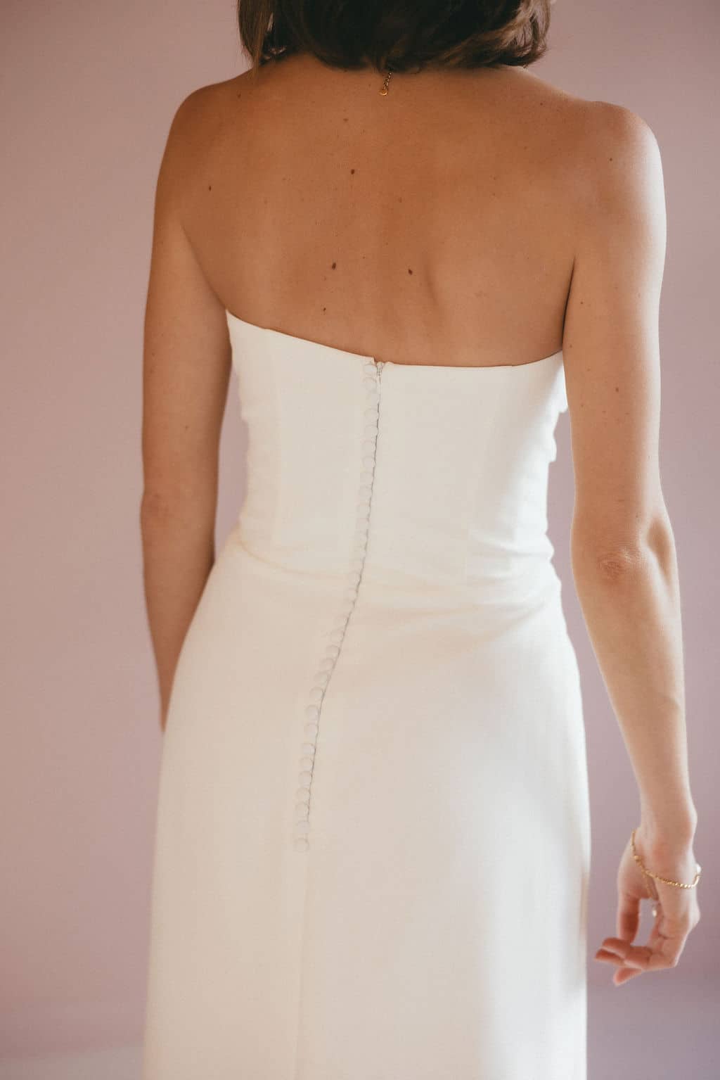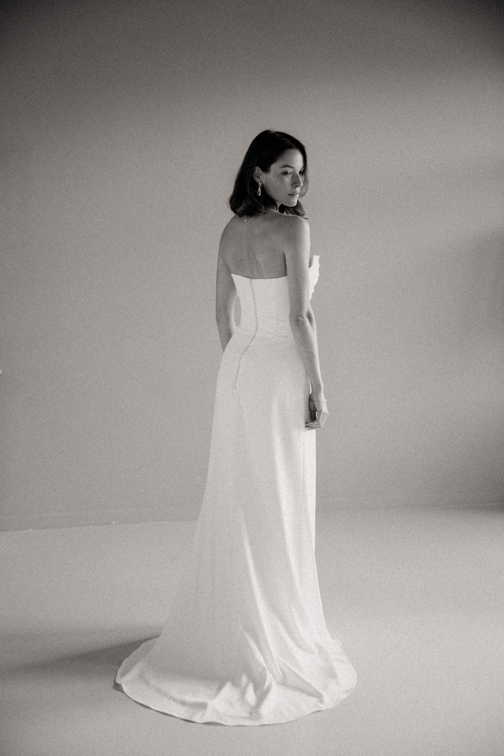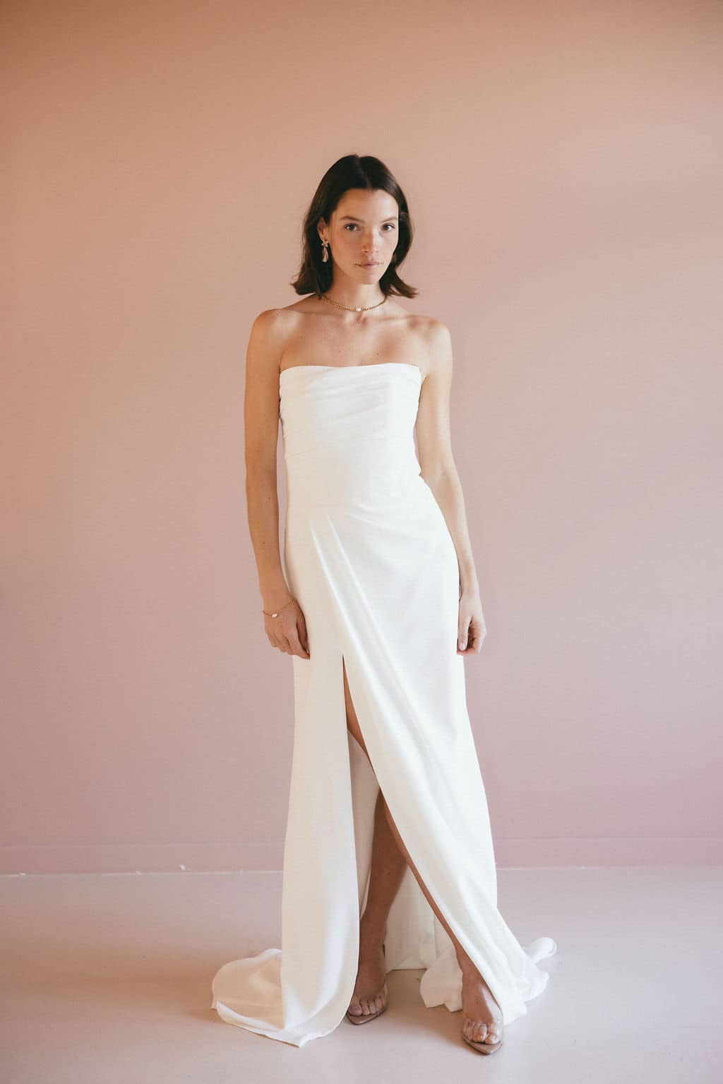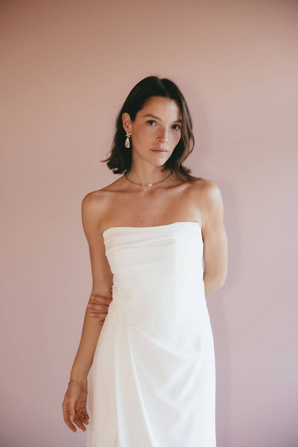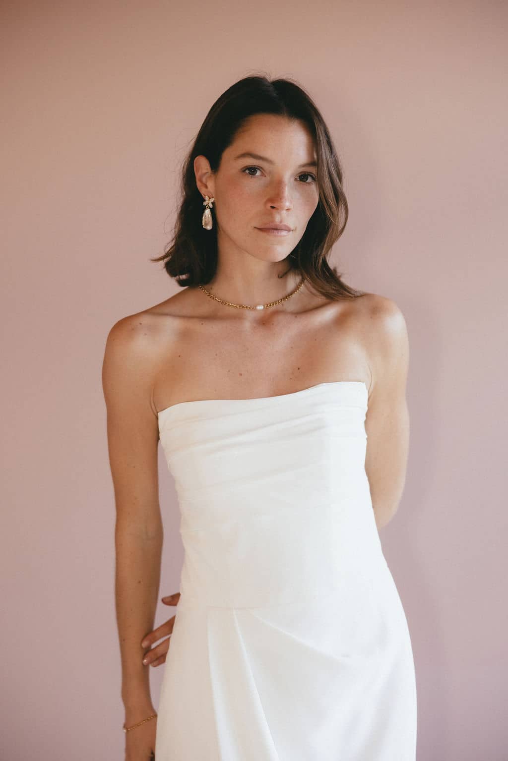 Elige nuestro vestido de novia a medida Mahault, un diseño sin tirantes confeccionado en crepé satinado. Destaca por su falda recta cruzada y su magnífico corpiño plisado. Este vestido será perfecto para las novias que buscan un estilo glamuroso.