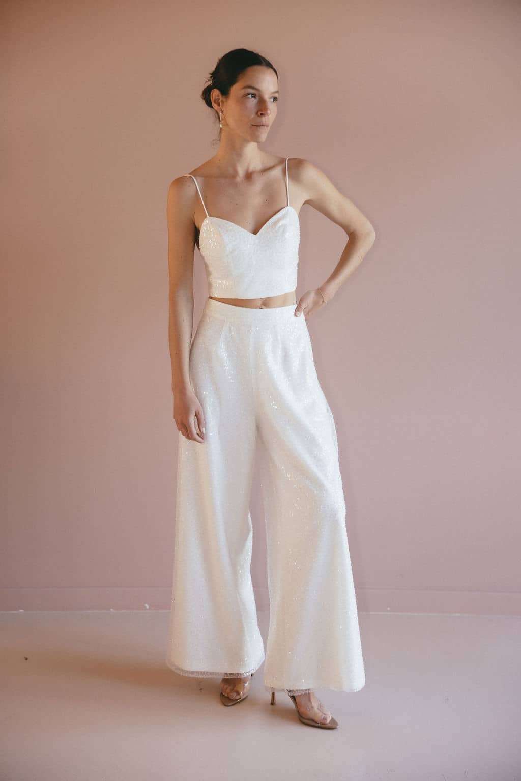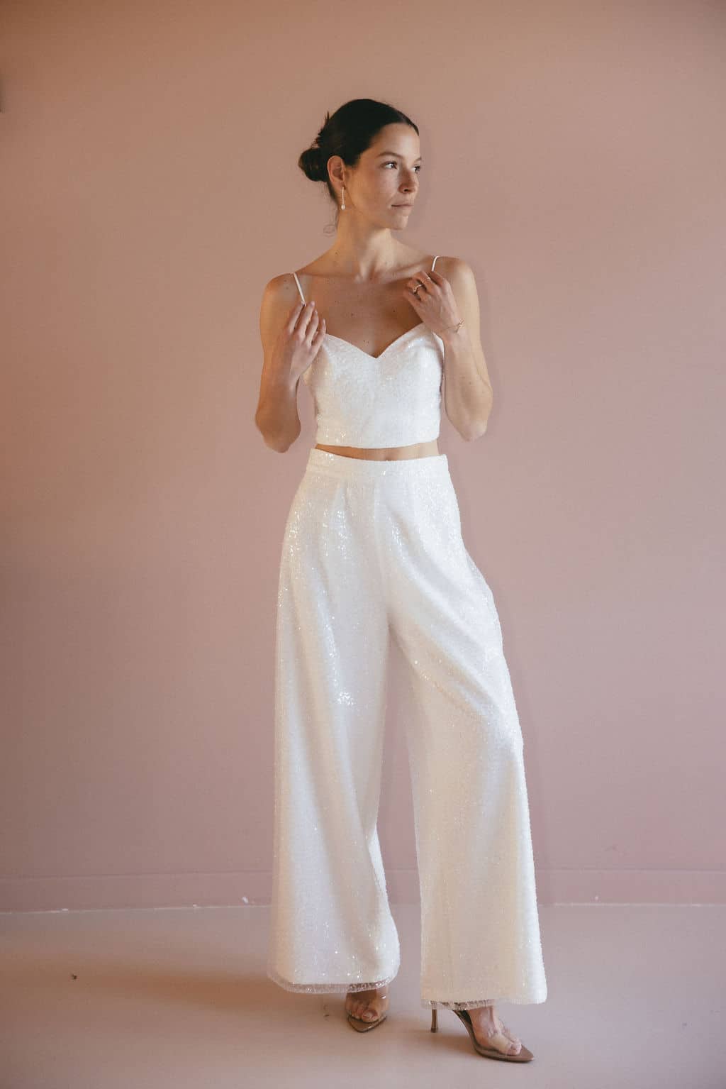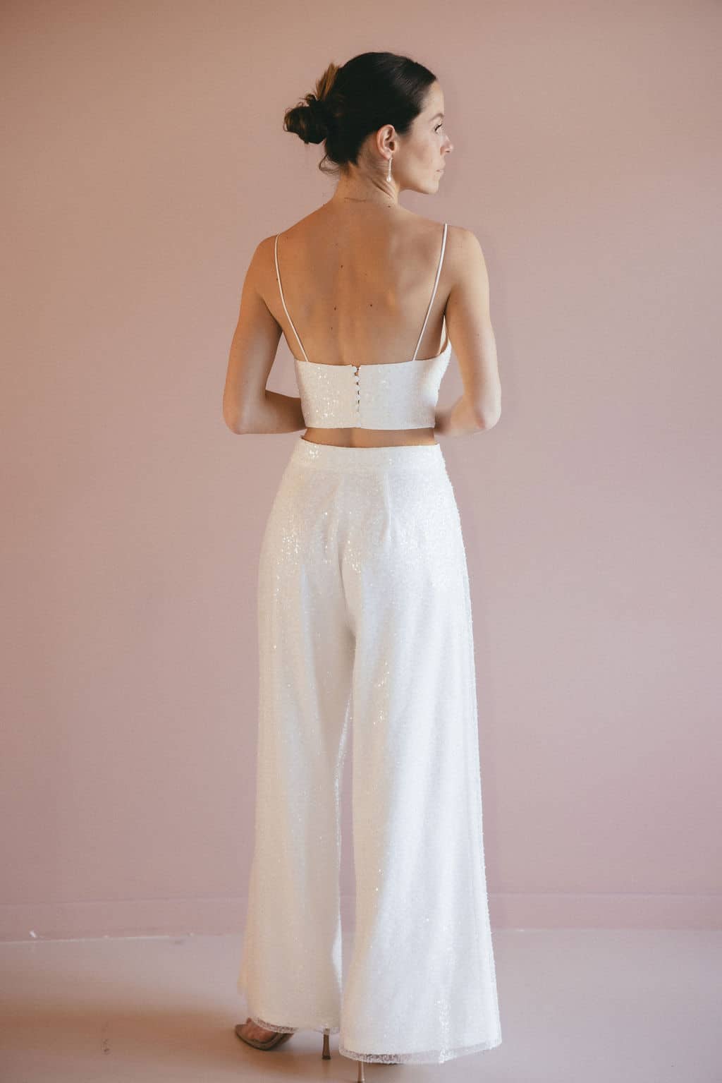 Descubre nuestros pantalones de novia Robbie con lentejuelas, perfectos para una boda civil o como segundo conjunto para brillar durante toda la velada. Elegantes y atrevidos a la vez, estos pantalones de novia con lentejuelas aportan un toque de glamour sin dejar de ser fáciles de combinar.