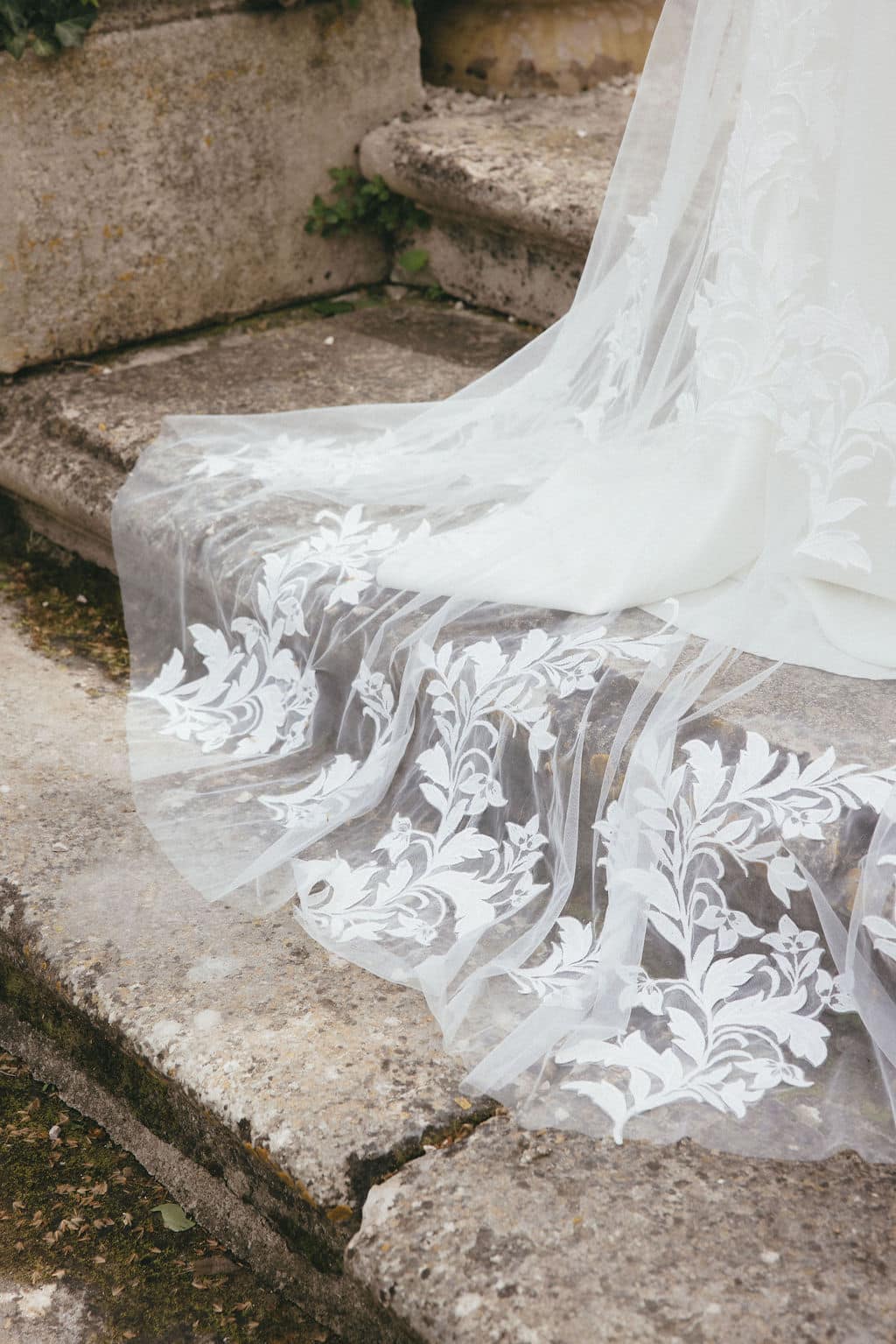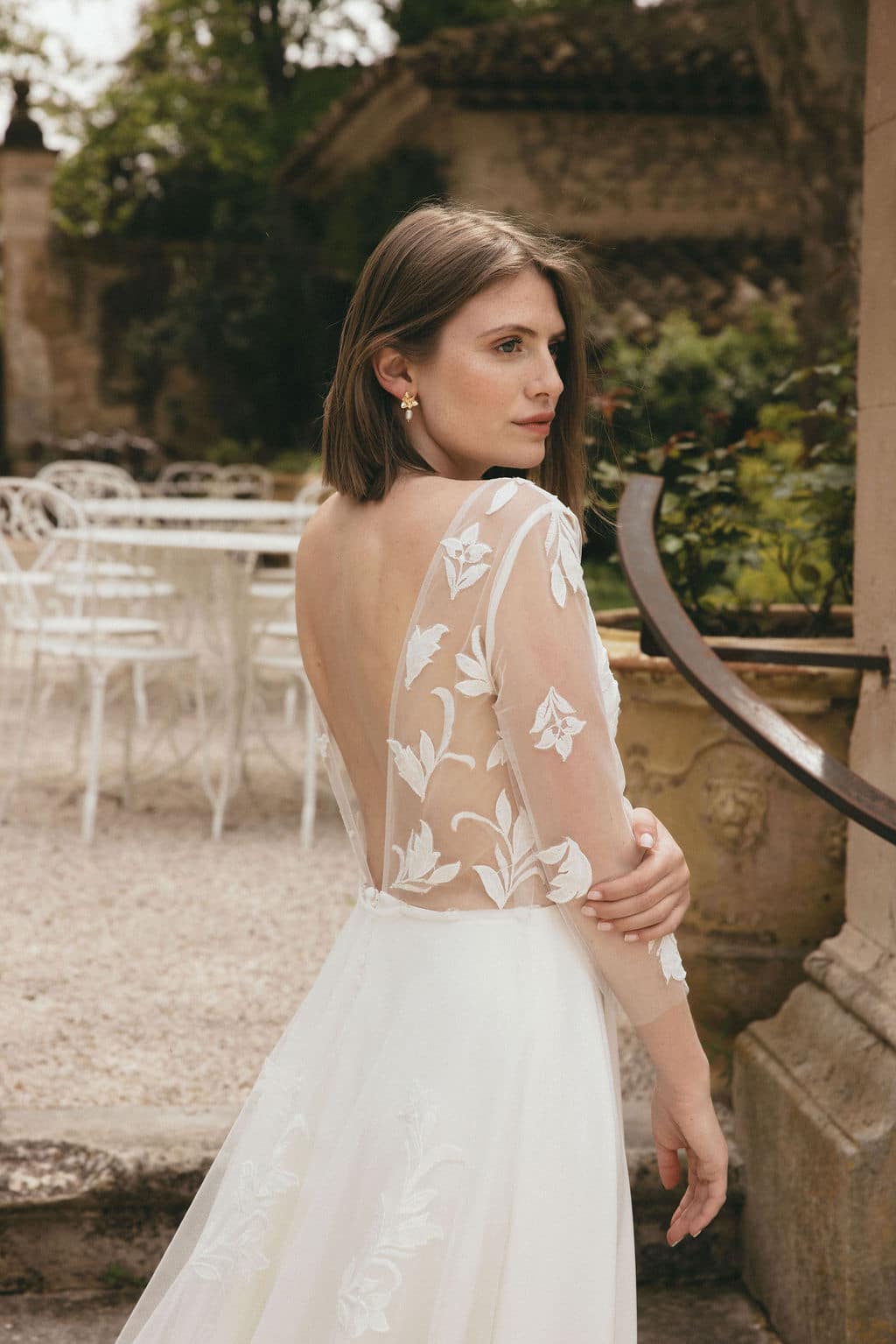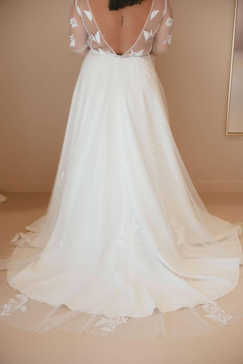 El diseño del vestido destaca por sus dos escotes en V, tanto en la parte delantera como en la trasera, que realzan el cuello y la espalda, así como por una falda fluida que le aporta un toque etéreo. La sobrefalda, con sus delicados y elegantes bordados, es perfecta para dar la impresión de llevar varios conjuntos el gran día.