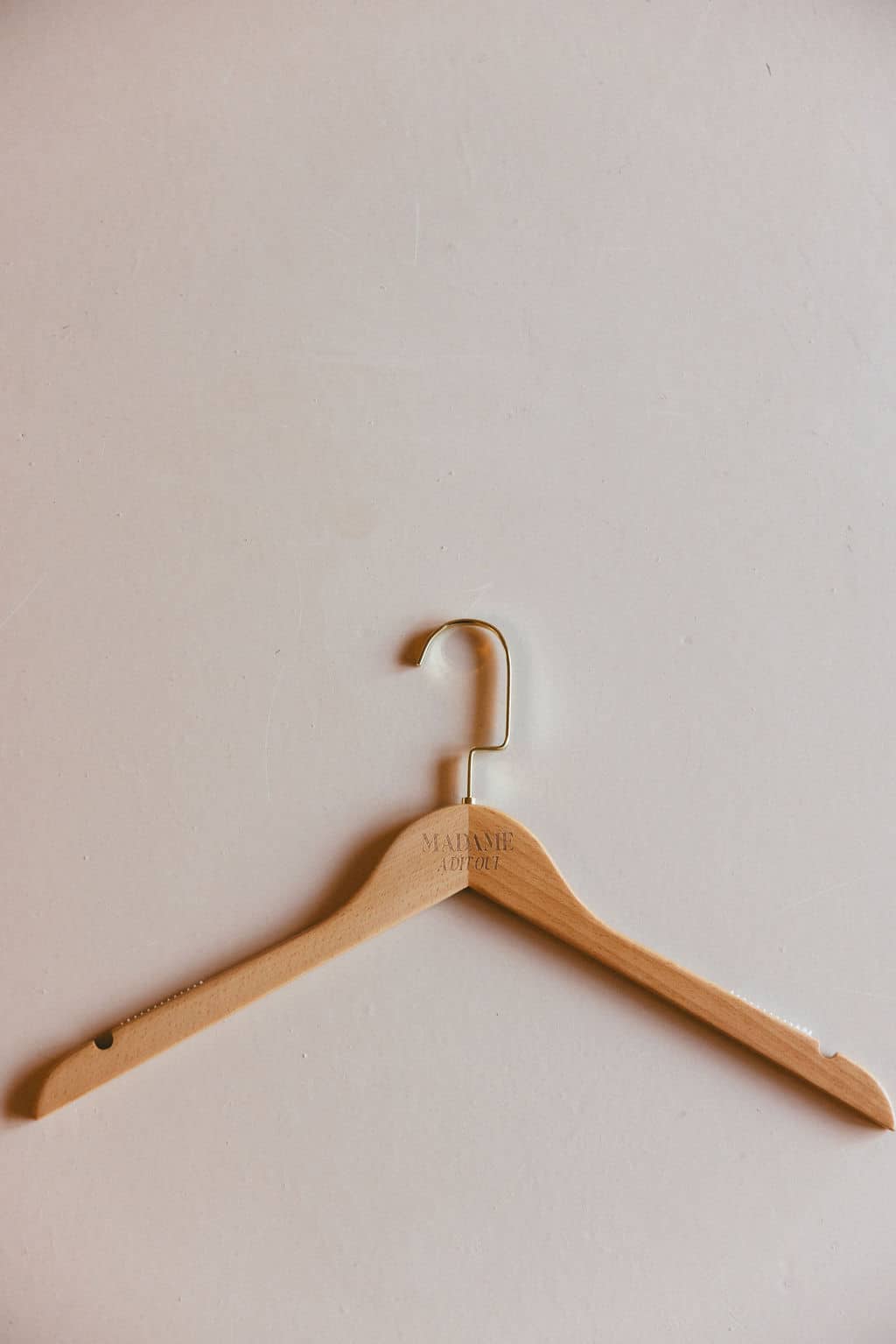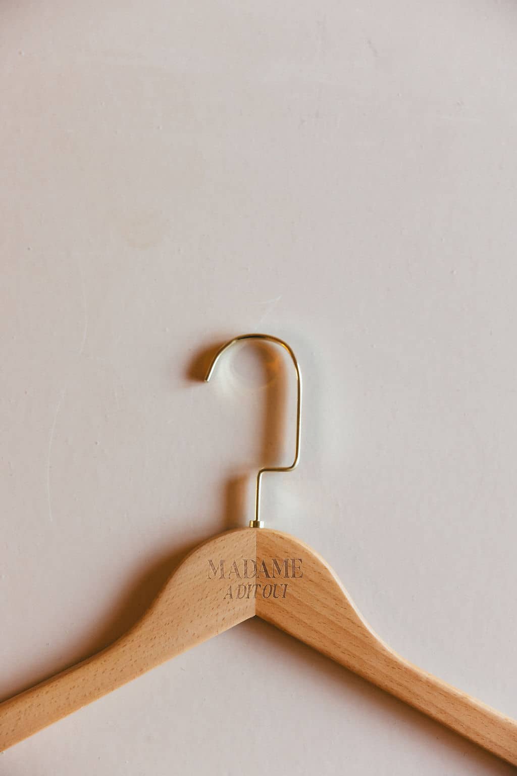 Cintres en bois massif élégants et résistants, sublimés par une gravure "Madame a dit oui" rehaussée d’une finition dorée raffinée. Un accessoire à la fois pratique et décoratif, idéal pour suspendre votre robe le jour J tout en apportant une touche chic à vos photos de préparation. Ces cintres robe de mariée sont parfaits pour une touche d'élégance le jour du mariage.