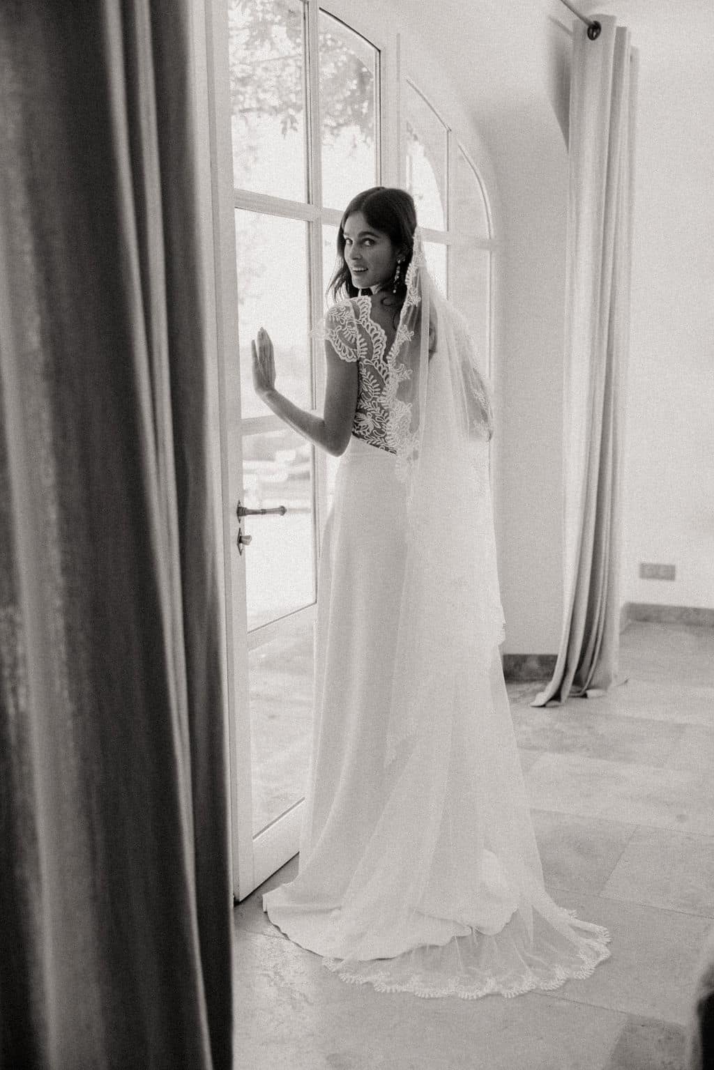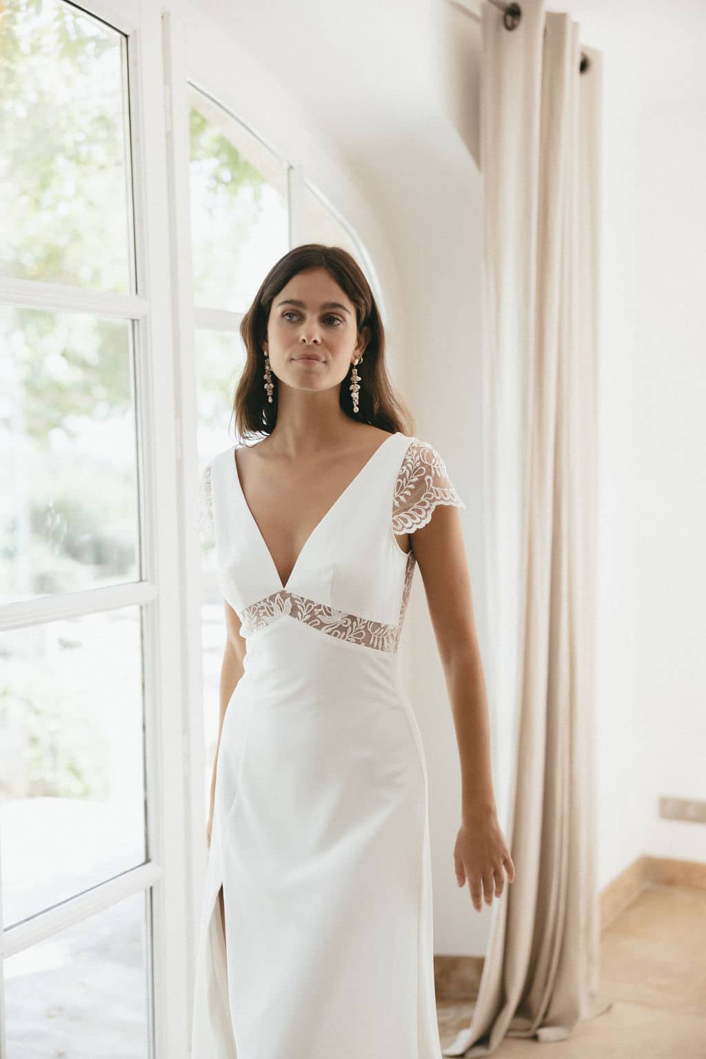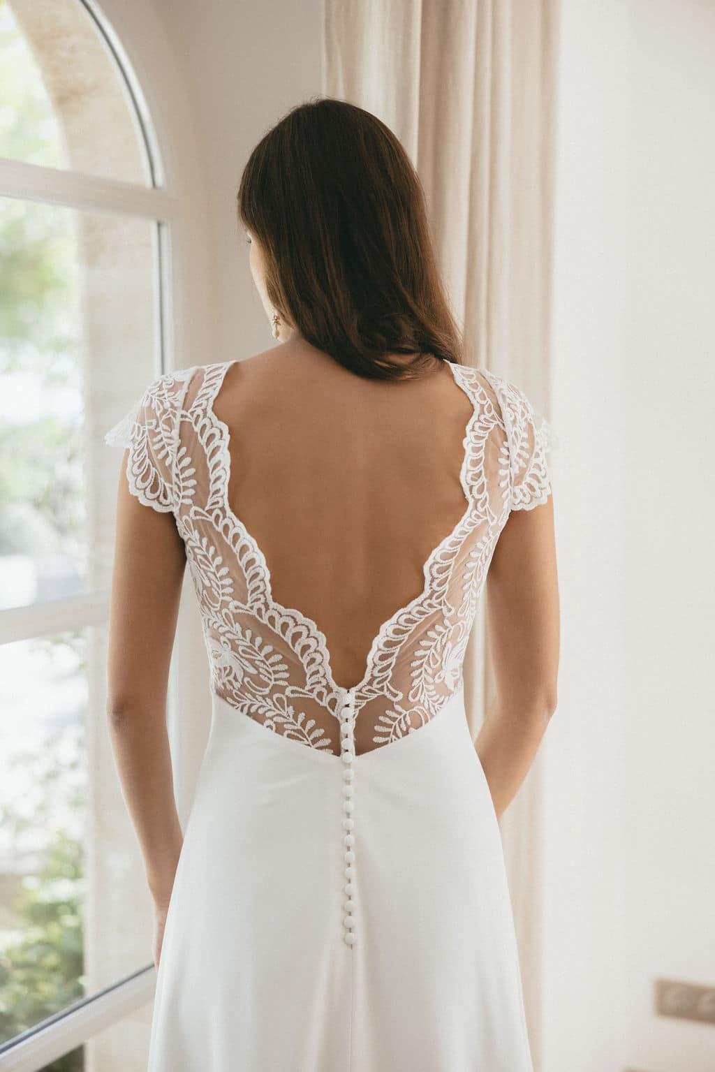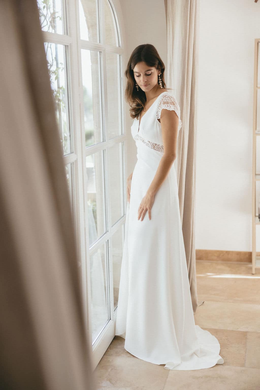 Sur cette photo notre mannequin porte la taille 34. La robe est accessoirisée avec notre voile Pauline.