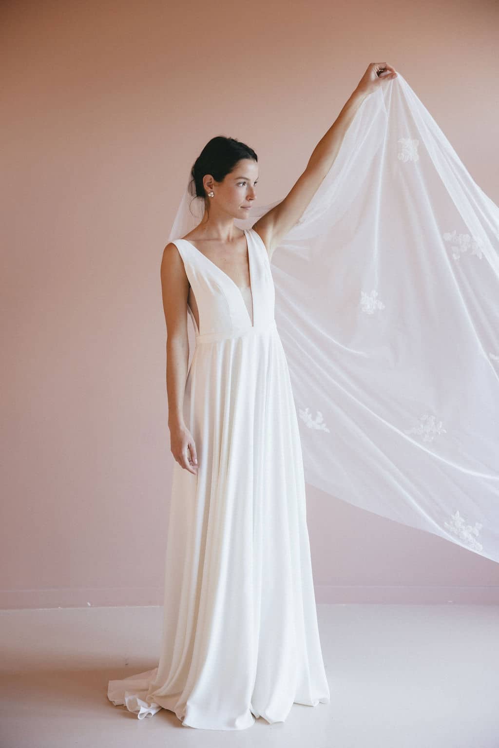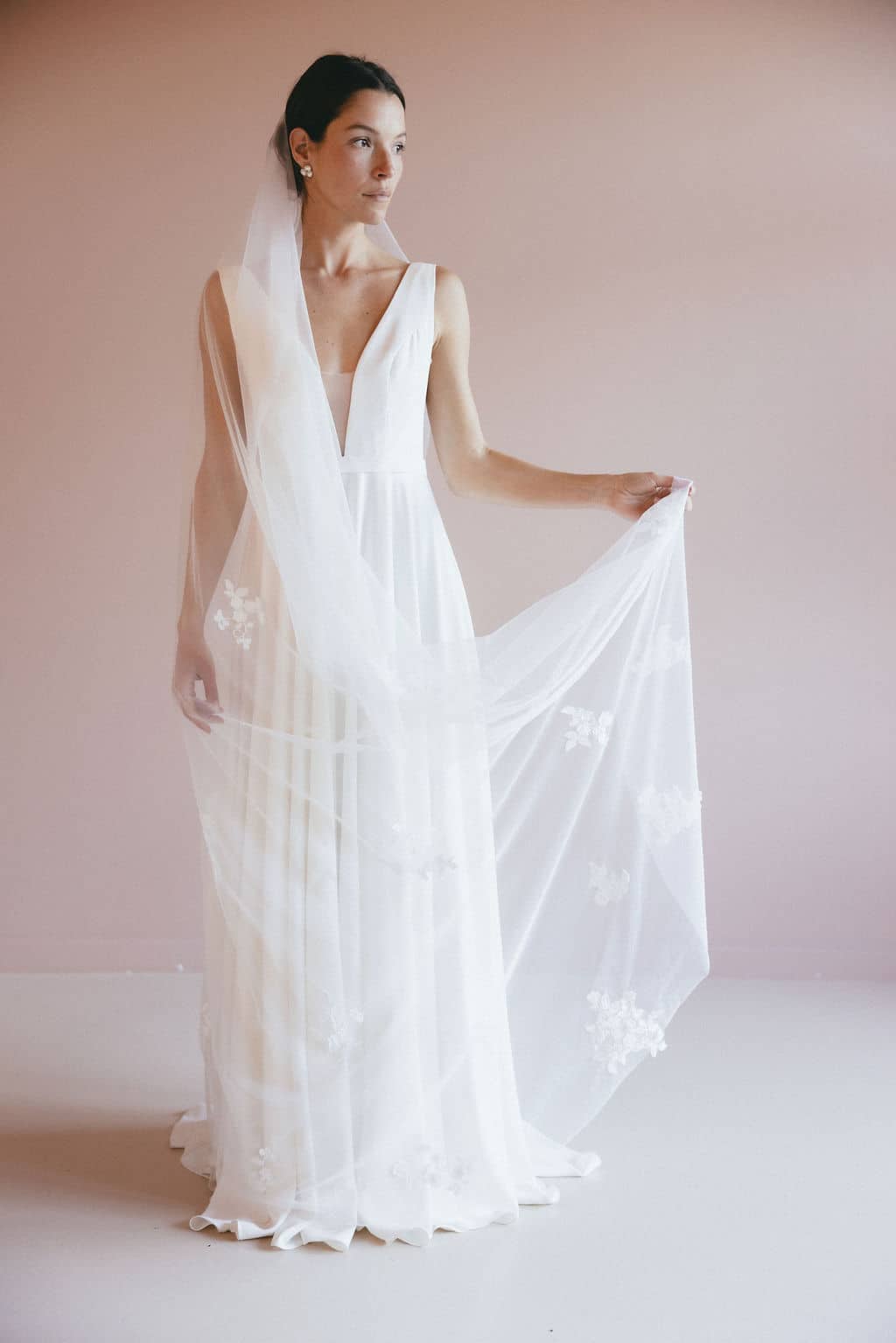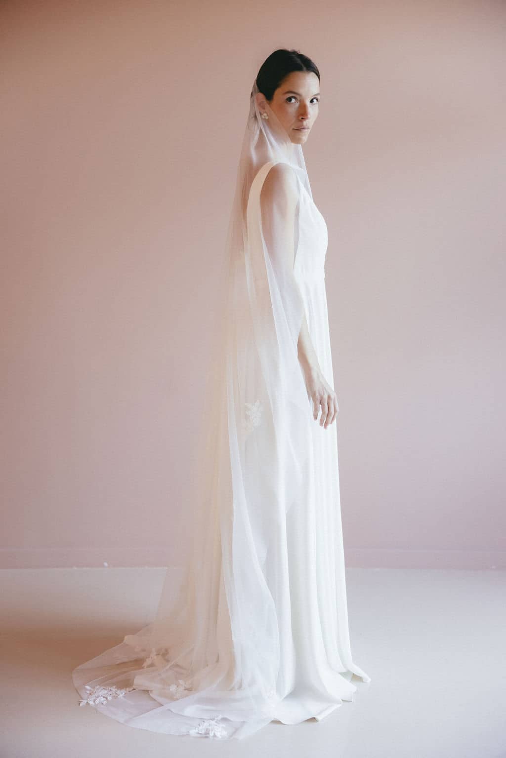 Sa longueur sublime la démarche de la mariée et apporte une touche de poésie à chaque mouvement. Les broderies, disposées avec finesse, ajoutent du relief et de la délicatesse tout en laissant la transparence du voile révéler la robe avec subtilité.